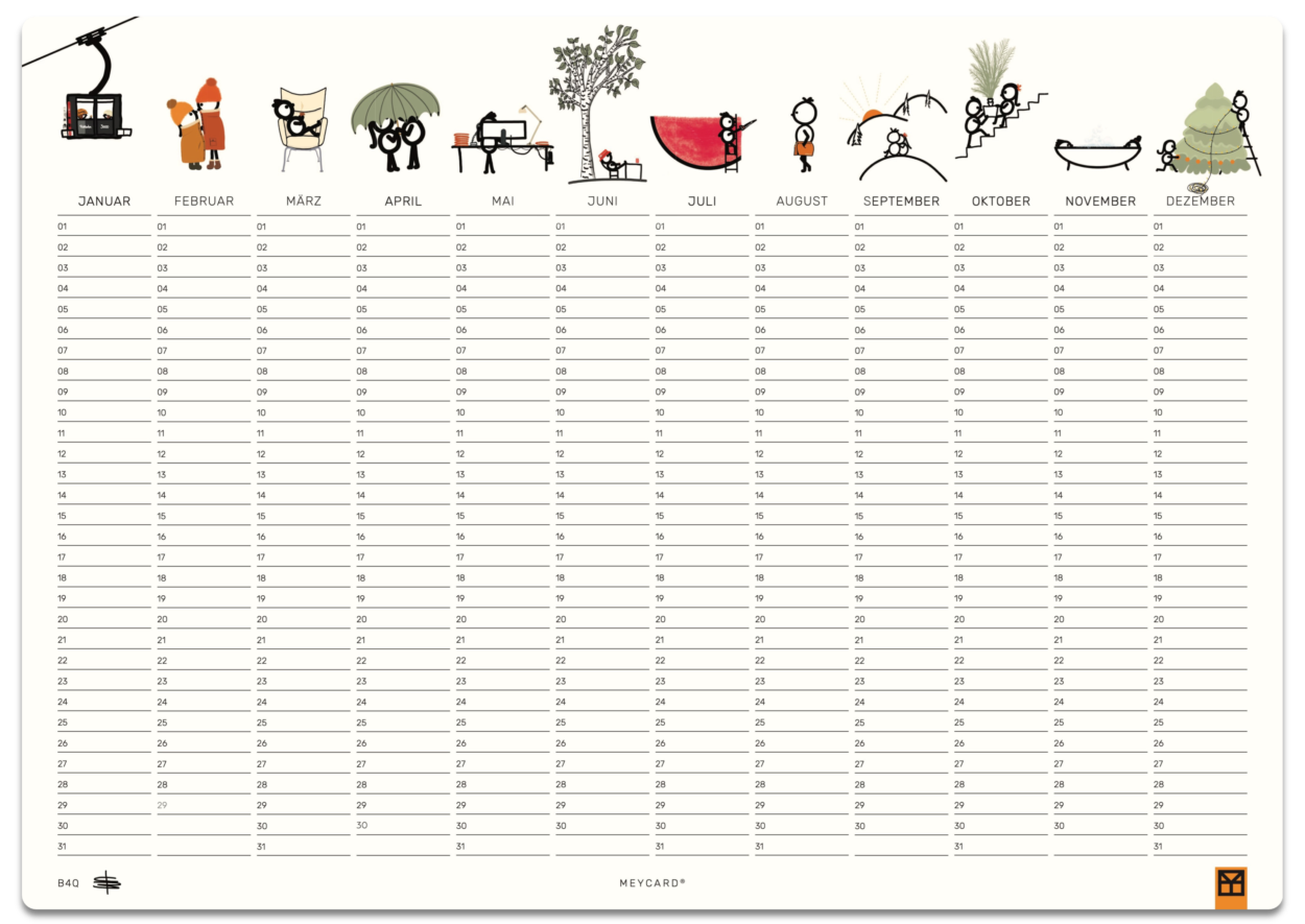 - Übersichtlicher, illustrierter Wandkalender von MEYCARD im Format DIN B4 (35,5 cm x 25,0 cm) ohne Datum, freie Rückseite